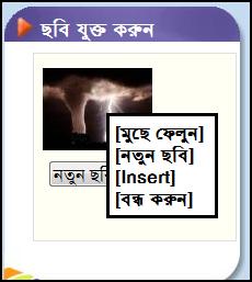 আপলোড হয়ে গেলে দেখবেন, বক্সে আপনার আপলোড করা ছবিটি দেখাচ্ছে। ছবিটির উপর মাউসের লেফট বাটন ক্লিক করুন এবং "Insert" ক্লিক করুন(শুরুতে লেখালেখি করার জন্য যে বক্সটি আছে, সেখানে ফাঁকা জায়গায় একটি ক্লিক করতে ভুলবেন না যেন!! নইলে আপনি আপনার কাঙ্খিত লিংক কোথা থেকে সংগ্রহ করবেন??).....